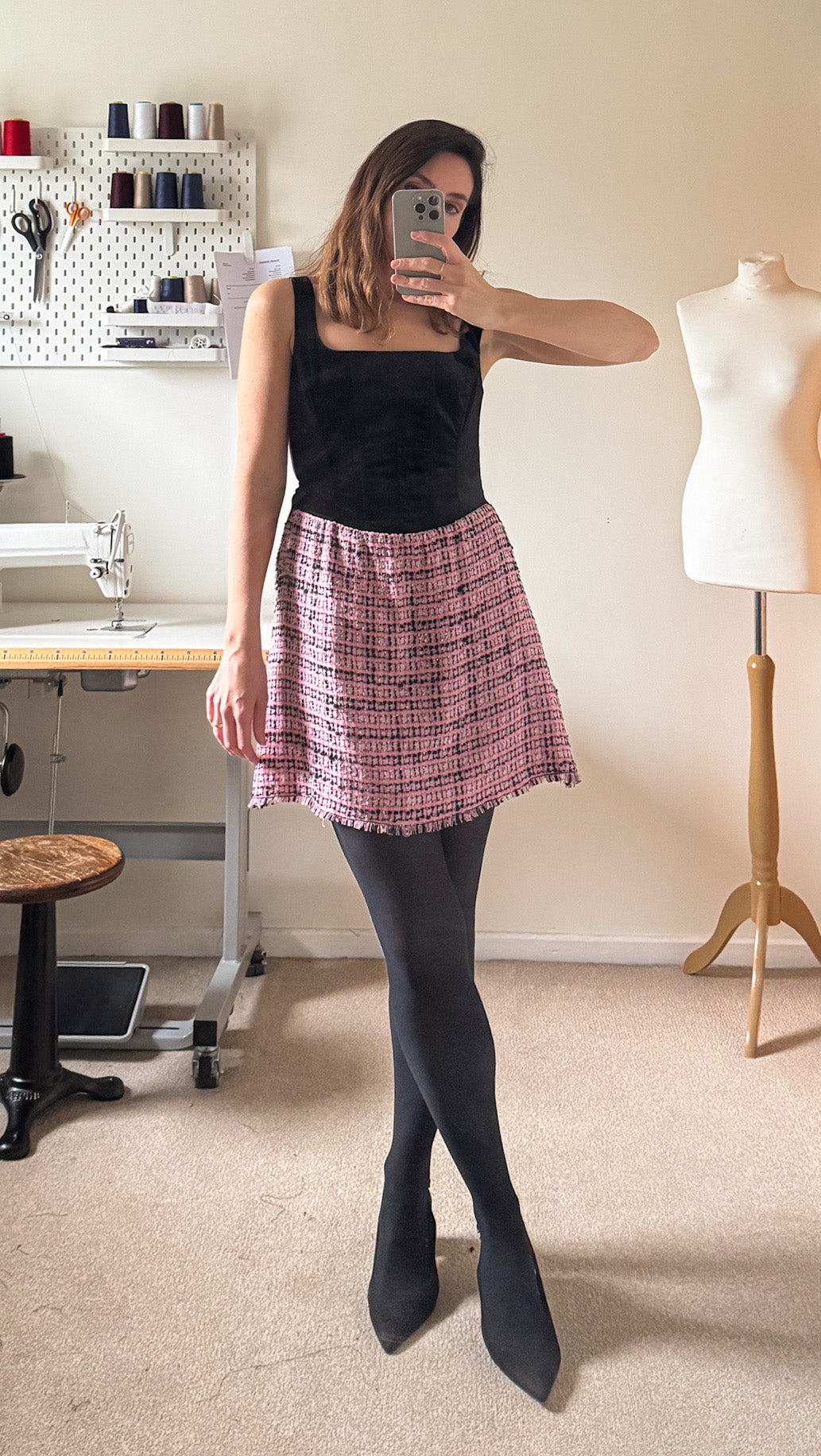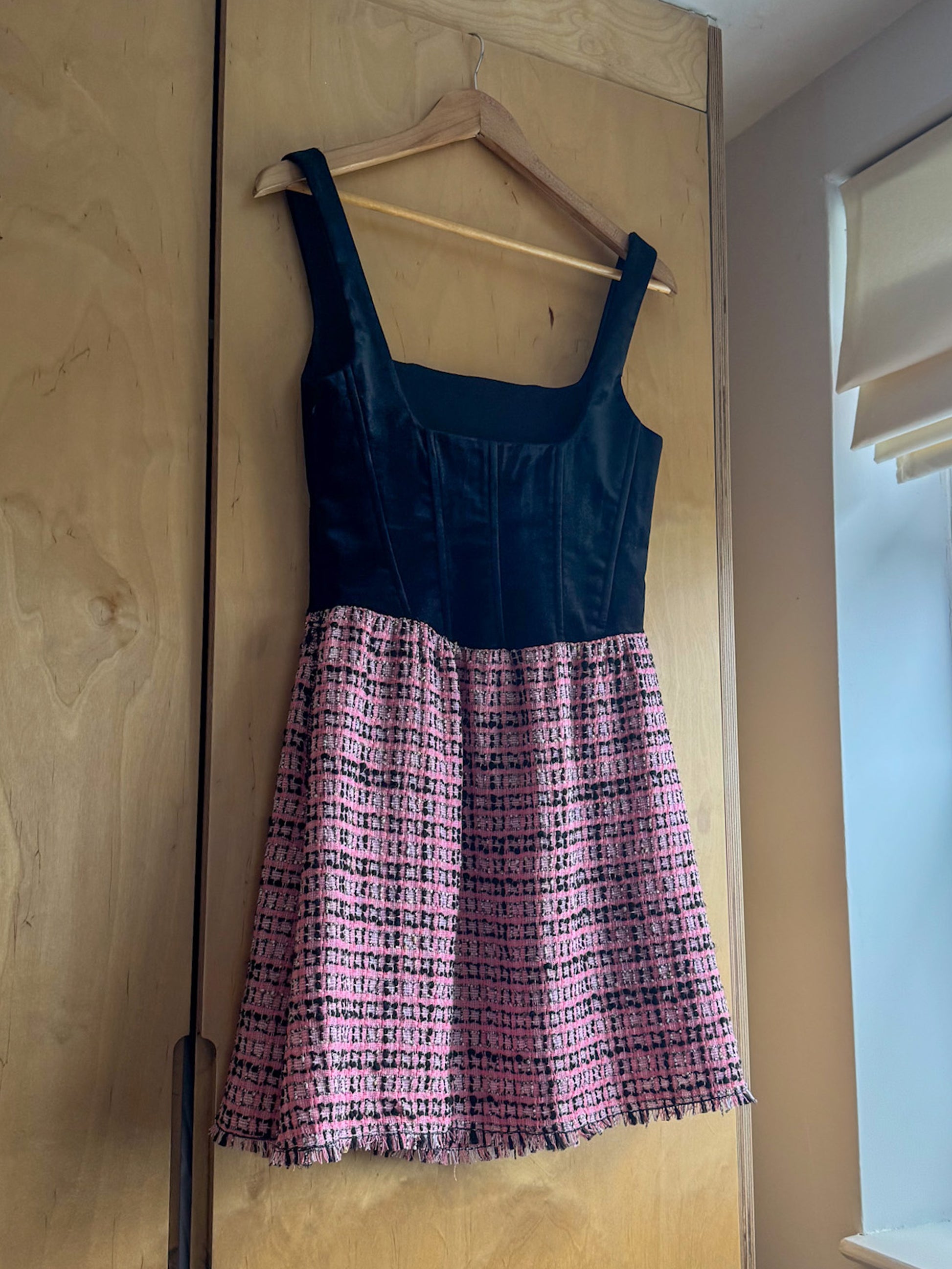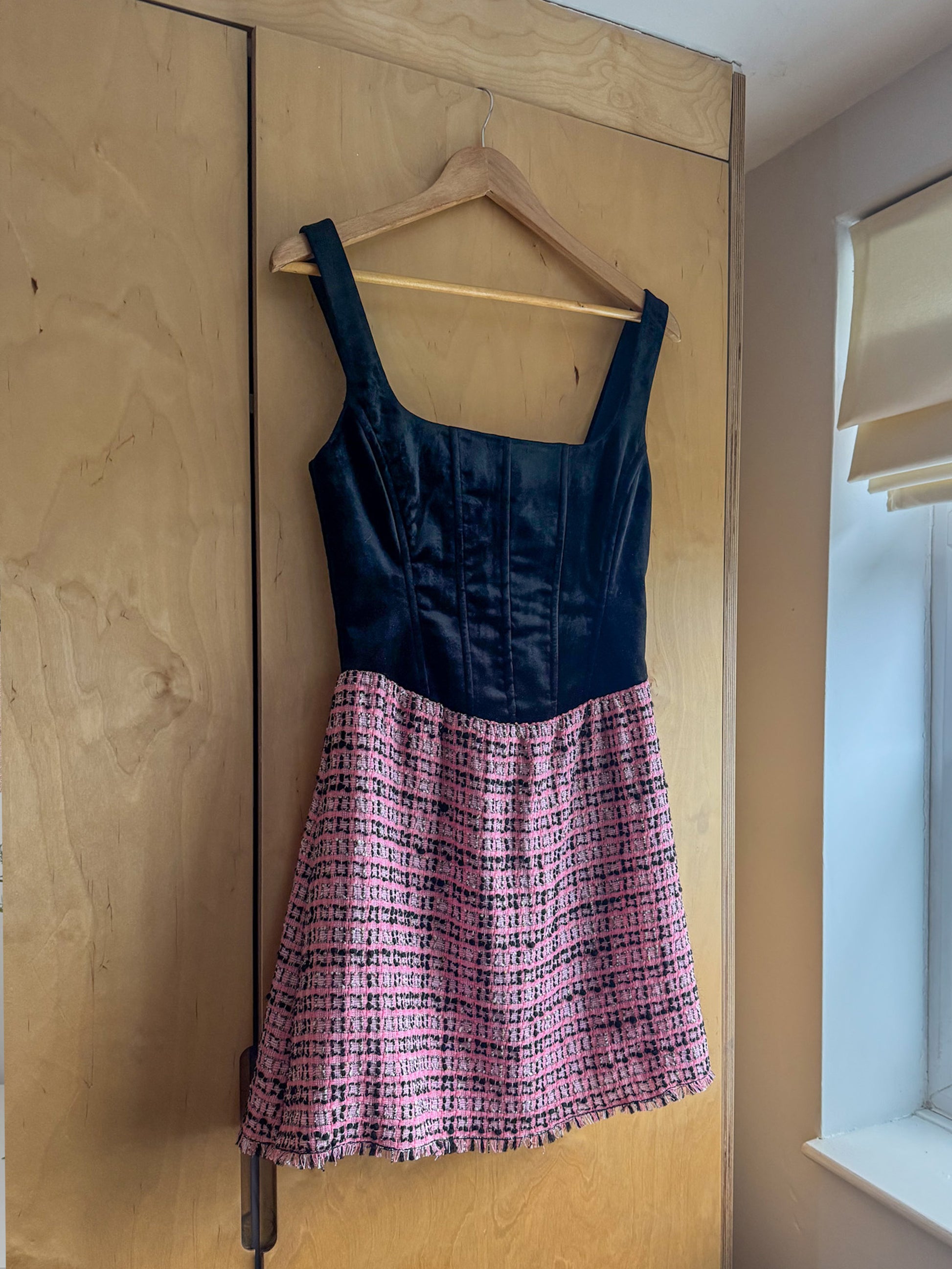 Handmade using premium Linton boucle and recycled velvet, the MOLLY dress is a playful corset mini dress.